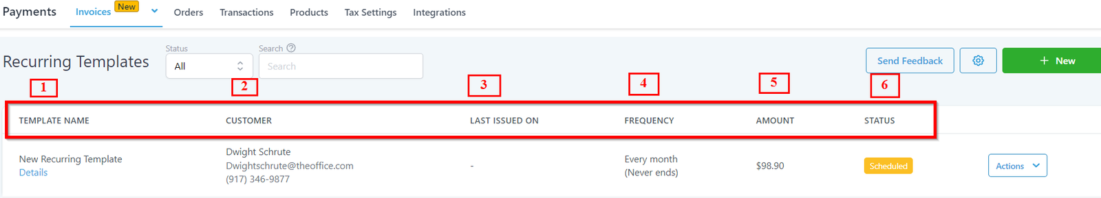 5.Amount – Shows the Invoice amount for the individual recurring invoice.