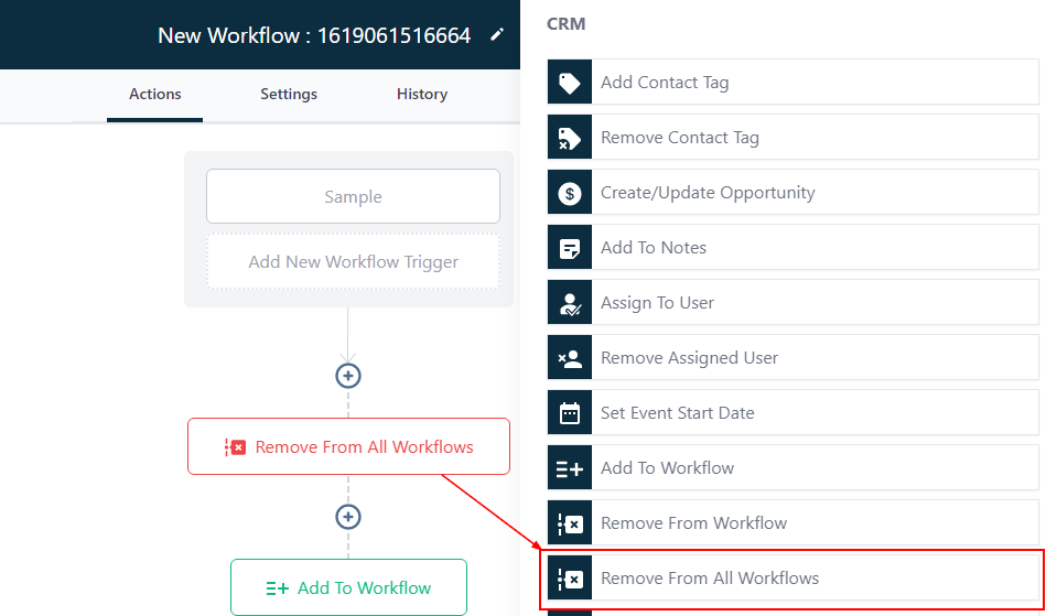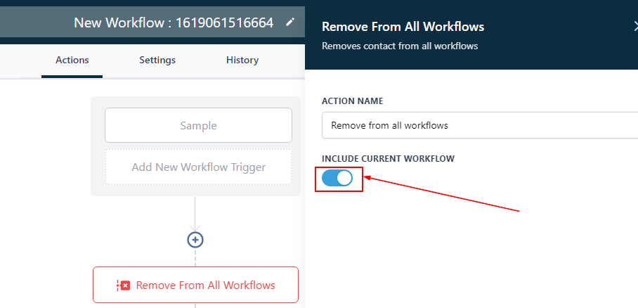 By using this action, you can remove a contact from all workflows including the current workflow you are building.