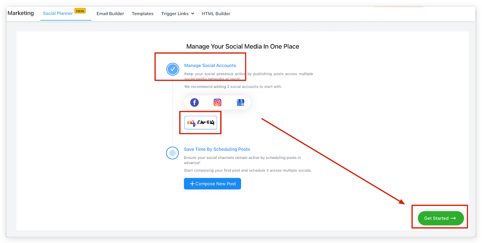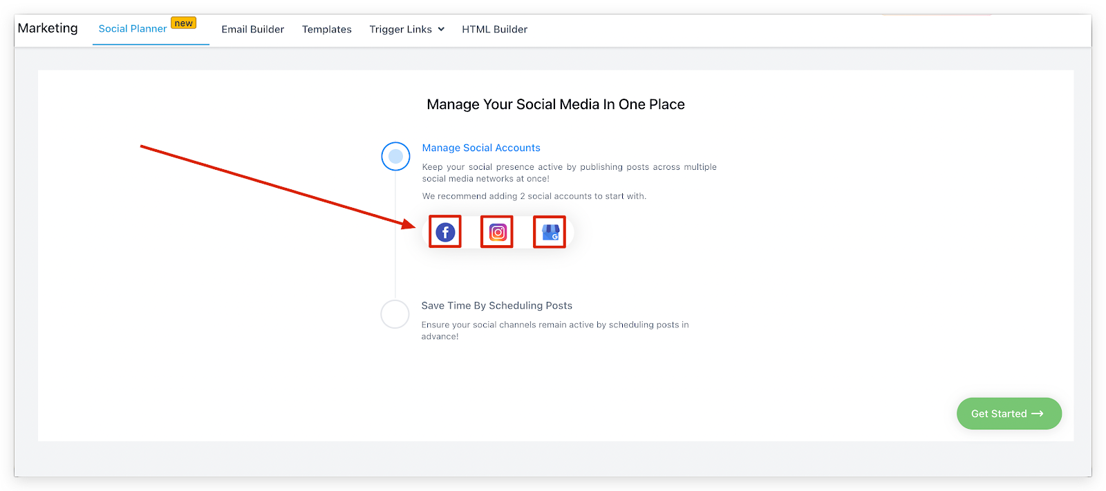 To move to the next step and start scheduling your social media posts simply click on the ‘Get Started’ button in the bottom right corner of the screen!