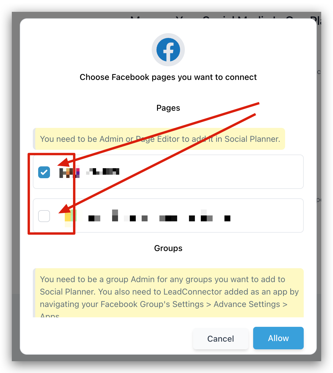 If you are connecting your Facebook page/group, after clicking on the Facebook icon you will see a popup that looks like this. You will need to select the pages/groups that you want to use for social posting by clicking the checkboxes next to their name.
