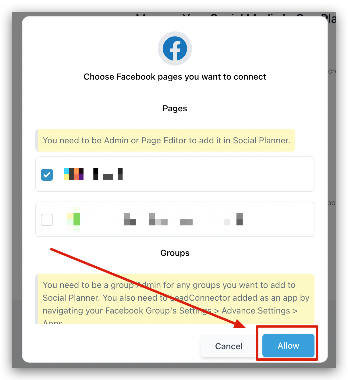 After selecting your pages/groups, make sure to click the ‘Allow’ button. This will establish a secure connection between your CRM and the page/group.