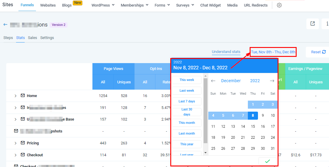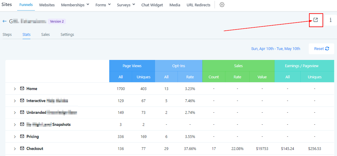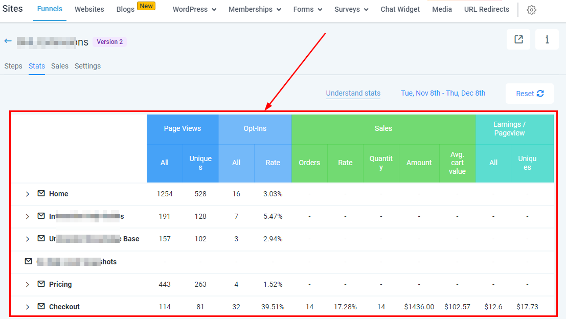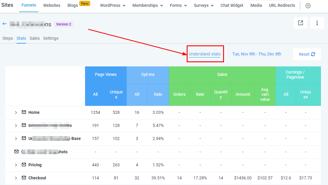 The “Stats Tab” shows you the statistics of each step created in a funnel. It shows you the number of visitors that opened your page and the actions they performed on each page.
