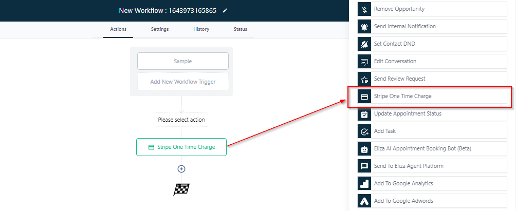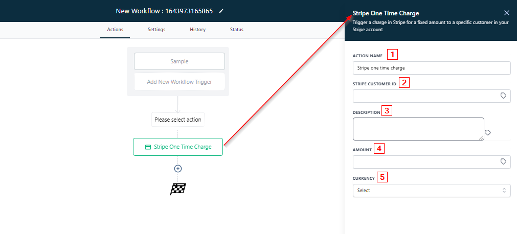 Stripe One Time Charge Leave a Comment / Automation / By Help Desk Stripe One Time Charge This action triggers a charge in Stripe for a fixed amount to a specific customer in your Stripe account 1. Action Name 2. Stripe Customer ID 3. Description 4. Amount 5. Currency