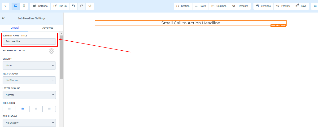To add a sub-headline, drag and drop the Sub-headline in the editor’s space to manage the settings.