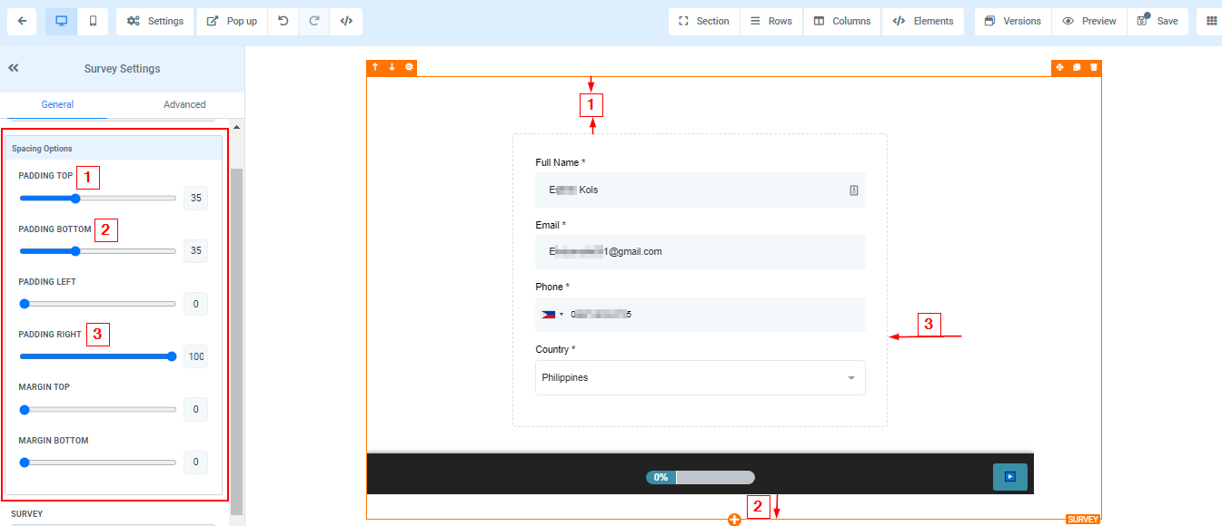 There are different spacing options available for adjusting your content. Depending on the Edit option you are working on, the settings will only be applicable to that option. For example, if you are editing a particular Row (the BLUE box), only every content in that Row will follow the command of what settings you make.