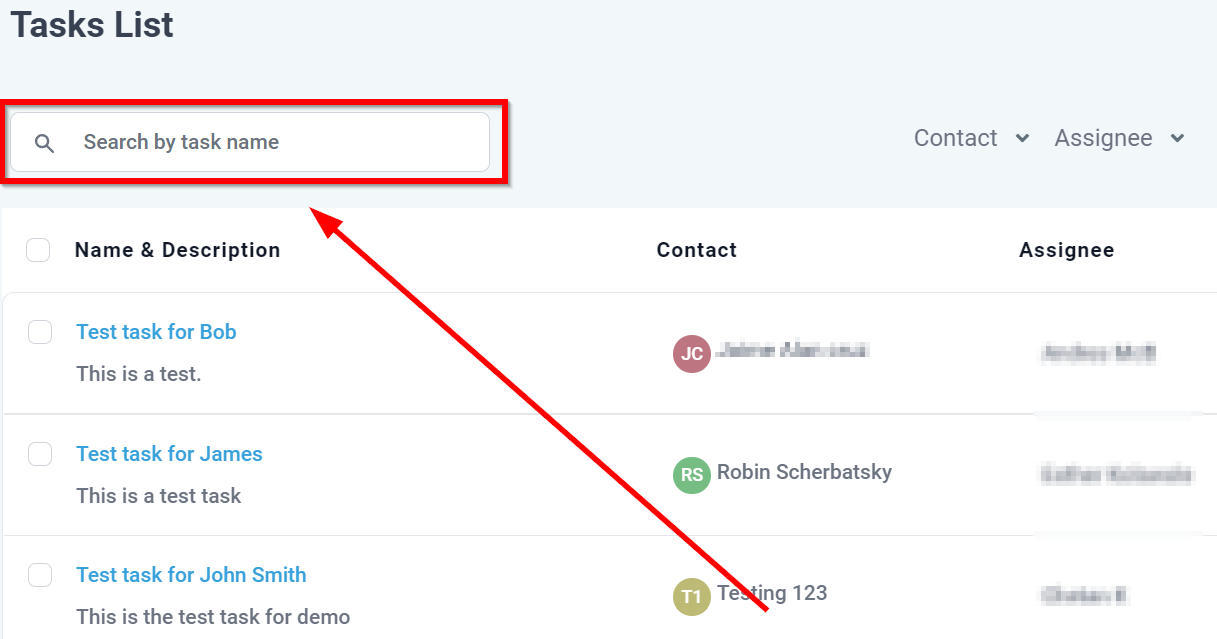 Tasks help your business keep track of important to-do’s and keep everything organized in one area of your CRM. Here you will see multiple tasks, associated with different team members, and different contact.