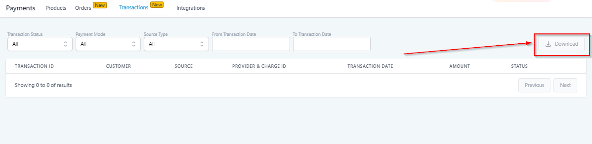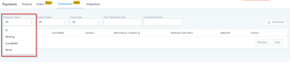 Here, you can filter the list by the transaction status; All, Pending, Succeeded, Failed.