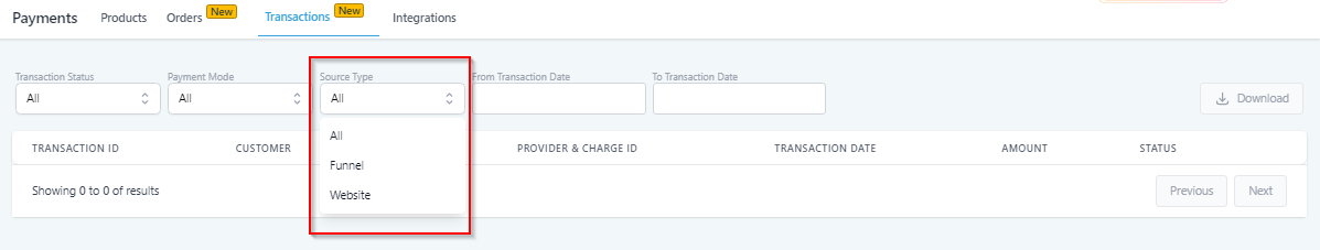 By clicking here, you can filter the transaction list by the source type.