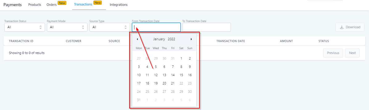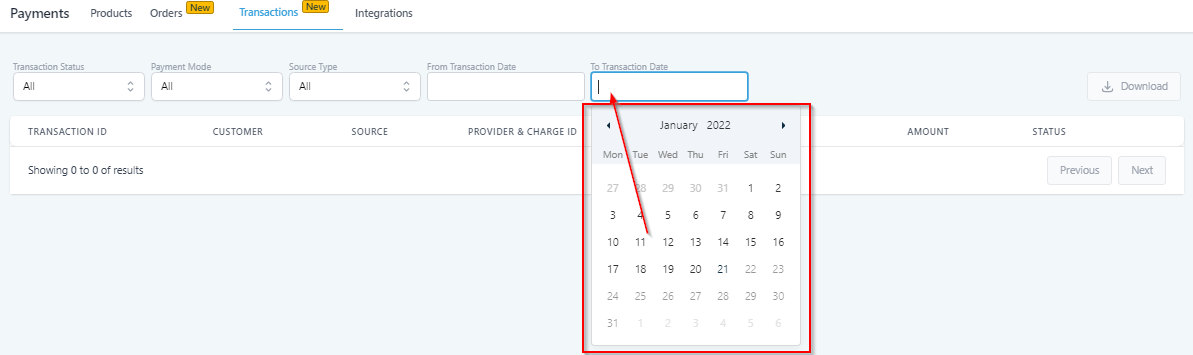 Filter the transaction list by date. Select the date you would like to start your search from here.
