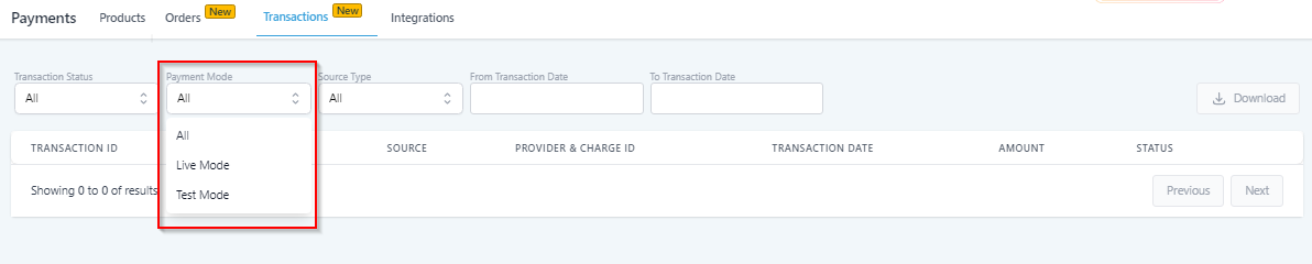 Here, you can filter the list by payment mode; All, Live mode, test mode.