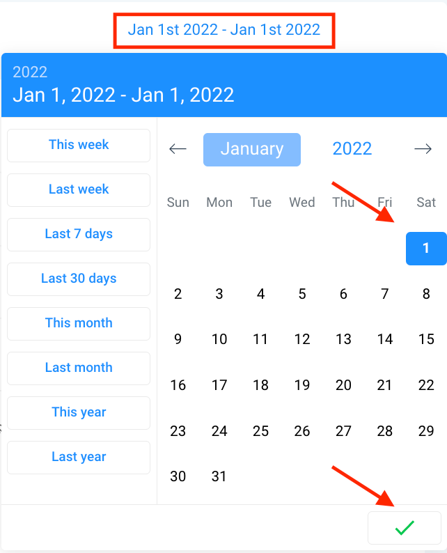NOTE: If you wish to view reporting metrics for one single day, be sure to check that date as the start and and end date. You must have both selected in order for the stats to appear. The example below shows how you can run reporting for January 1, 2022 by choosing January 1st as the start and end date: