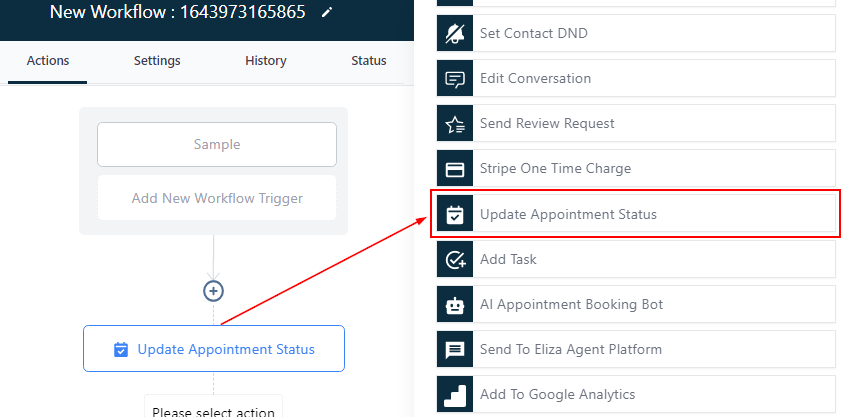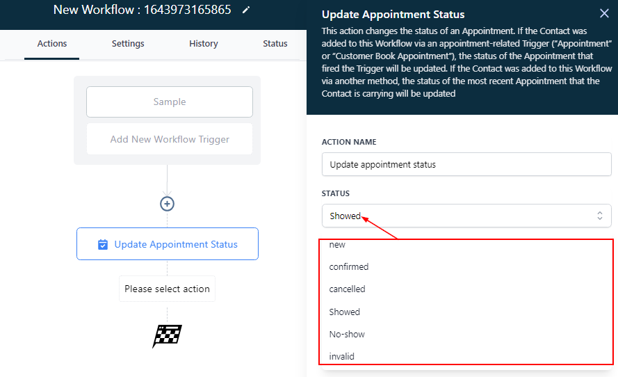 This action changes the status of an Appointment. If the Contact was added to this Workflow via an appointment-related Trigger (“Appointment” or “Customer Book Appointment”), the status of the Appointment that fired the Trigger will be updated.