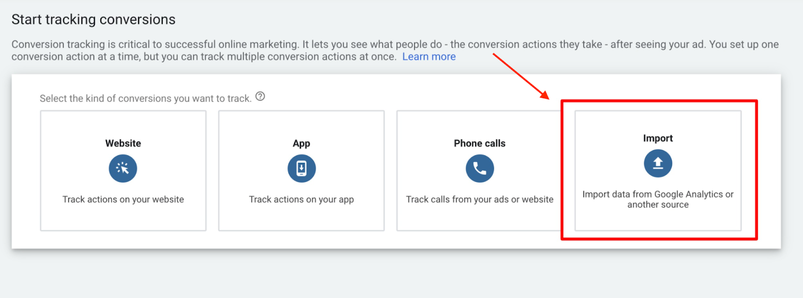 - To start tracking conversion, choose the import option from the list that appears.
