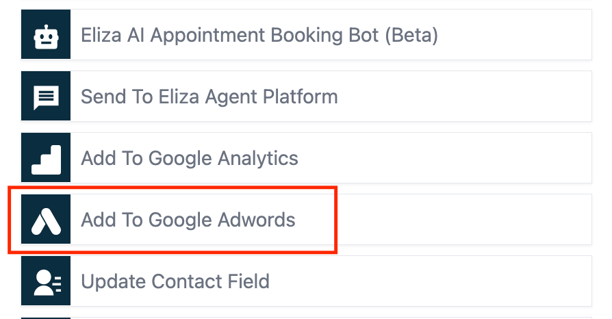 - Within the Workflow, add a step/action for “Add to Google Adwords”