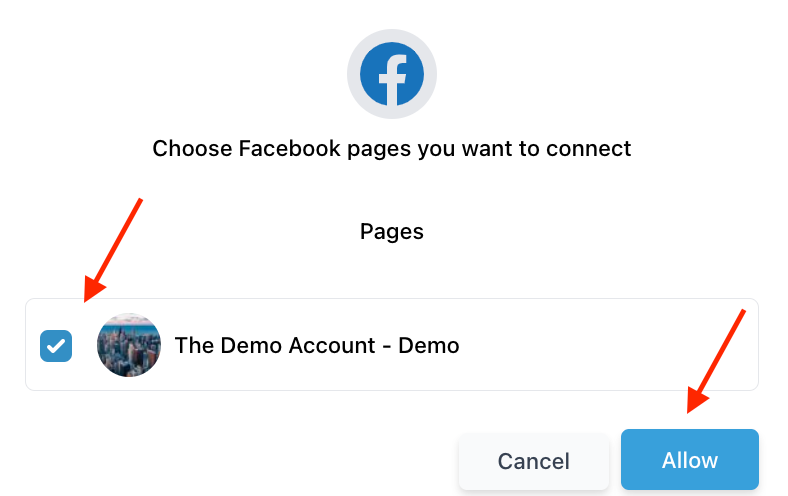 - The page(s) you selected above to allow permissions for are now ready to connect. Select one or multiple and click “Allow”. The integration will now be complete.