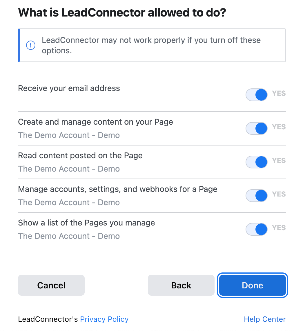 - When you integrate an account, a popup window will appear, asking you to give permissions to LeadConnector. Granting the permissions requested will allow the integration to complete.