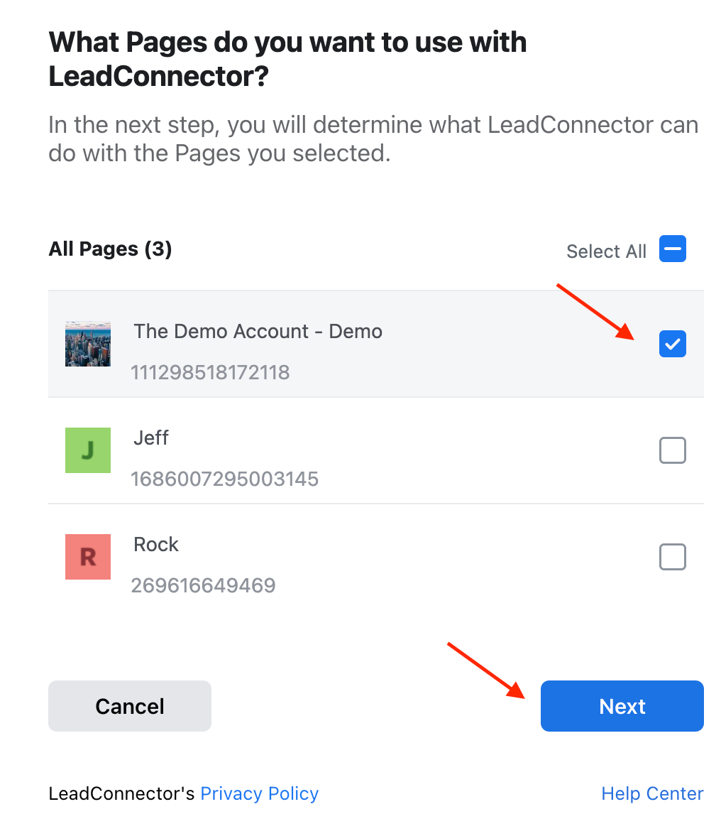 - Select one or multiple Facebook, GMB or Instagram account pages to integrate. Click “Next”.