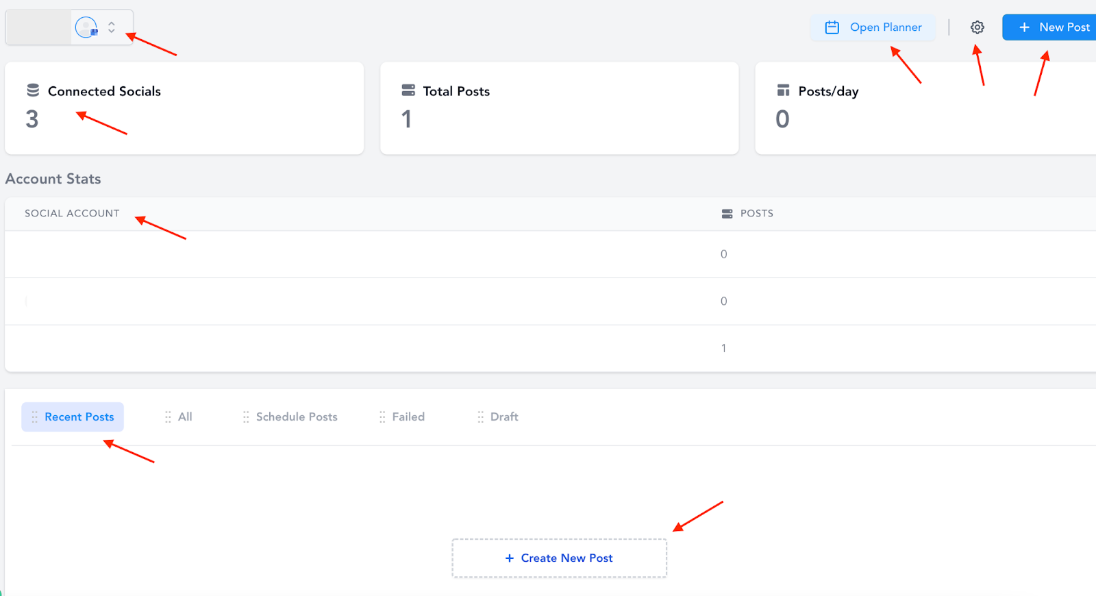 - Under “Recent Posts” you can sort through all, scheduled, failed, or drafted.