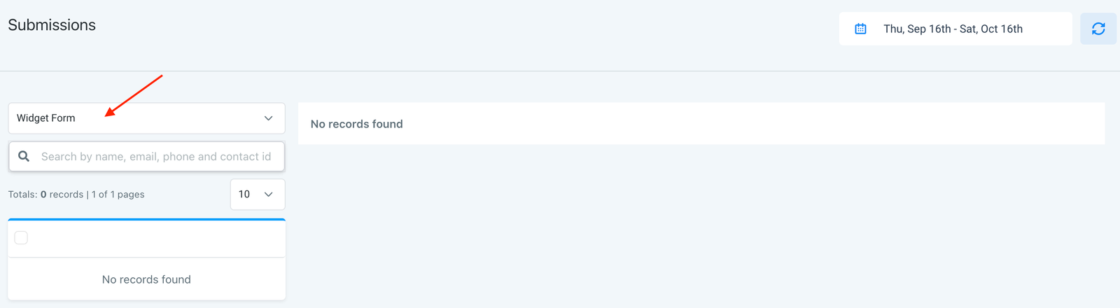 - Navigate to Forms > Submissions, and choose “Widget Form” from the dropdown menu.
