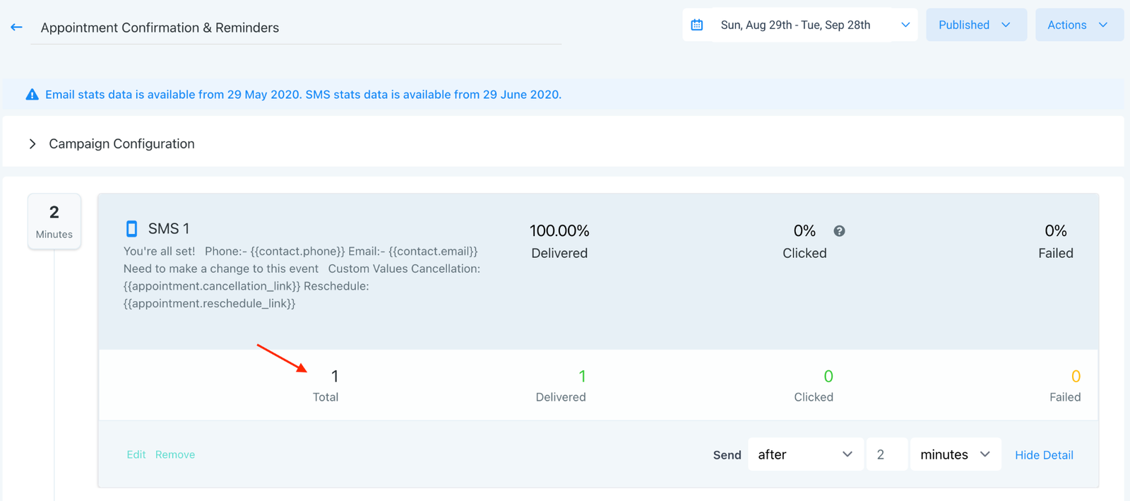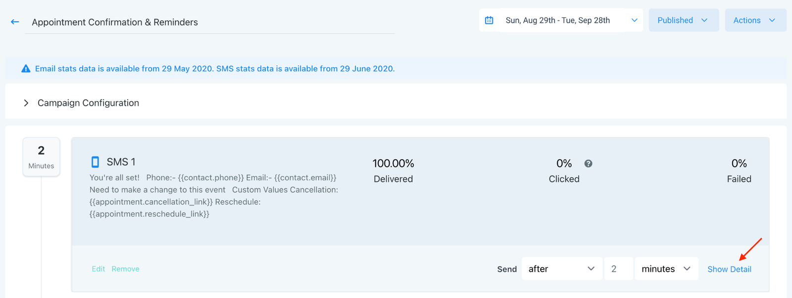 Step 3: Under each email in the campaign, in the bottom righthand corner, you’ll see a hyperlink for “Show Detail’. Click this to expand the tab, which will show the specific numbers.
