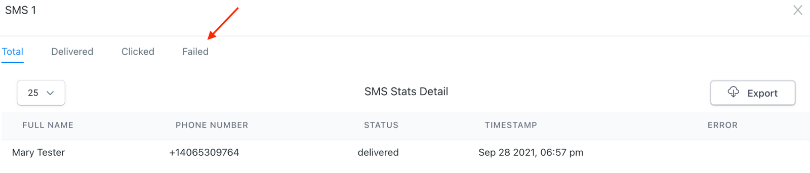Step 5: Within the new window, toggle between the tabs at the top to view Total, Delivered, Opened, Clicked, Replied, Bounced, and Unsubscribed. You can also export the list using the Export button, which will save as a download to your computer.
