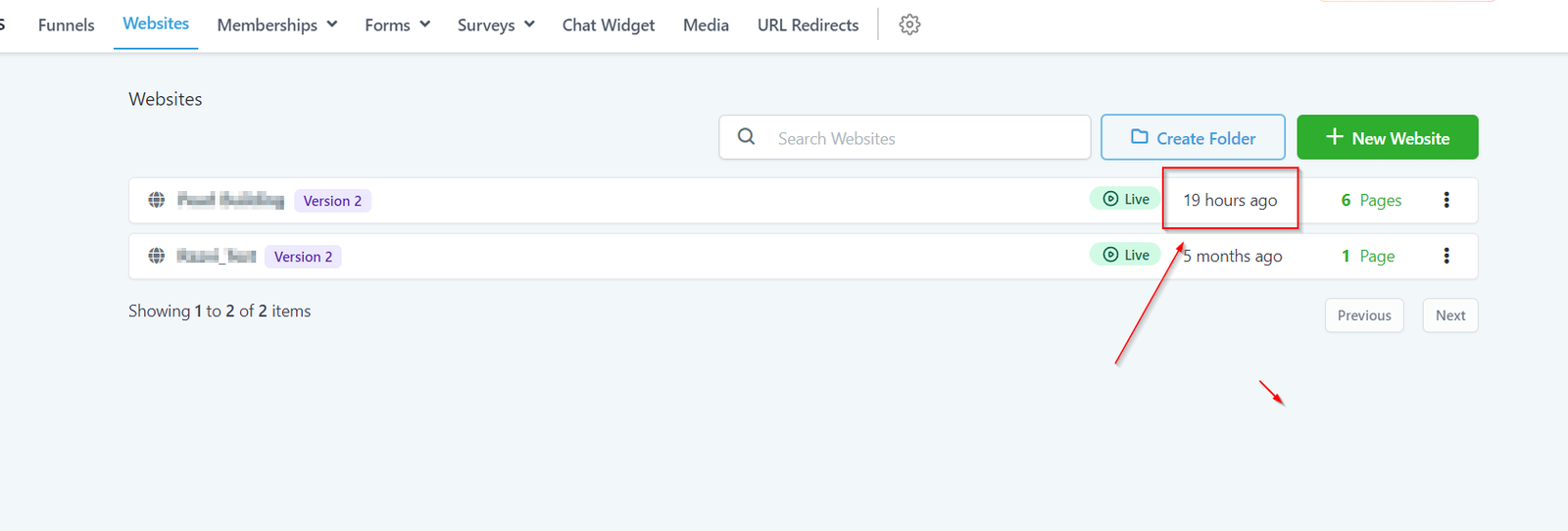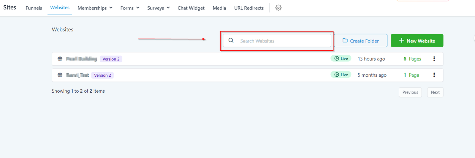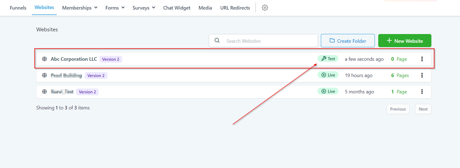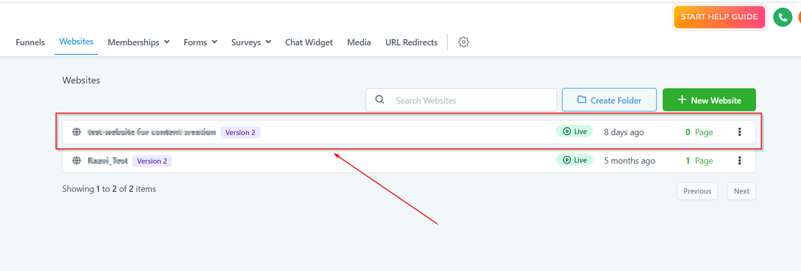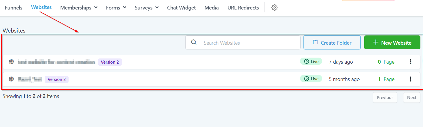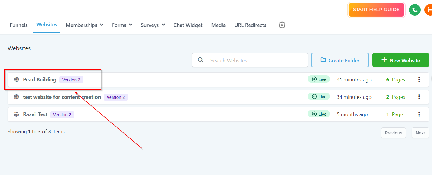 Here you can quickly find out the specific website from the list of all of the websites you have created inside of your CRM.