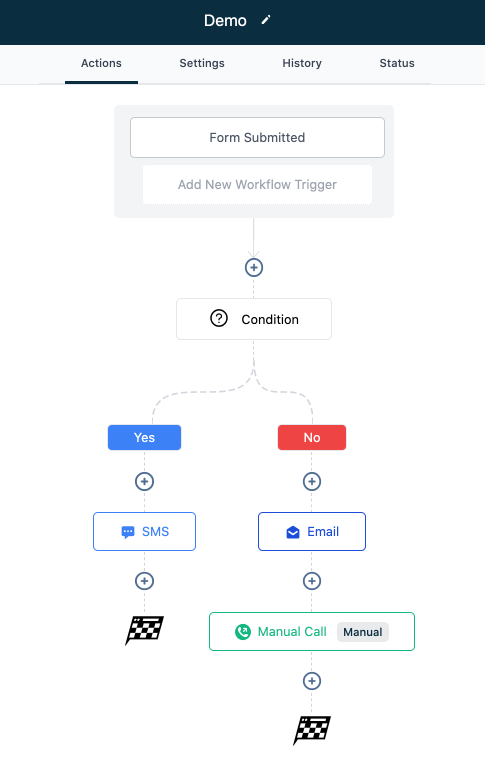 - Once you’ve added the If/Else condition, you will see a split in the Workflow path with “Yes” and “No”. Based on the filters from your If/Else condition, contacts will go down one of the two paths, and you can customize additional events. In this example, anyone with Los Angeles as their city and not having Bob as their first name, would receive a SMS under the “Yes” path. Anyone in the “No” path would receive an email and a manual call.