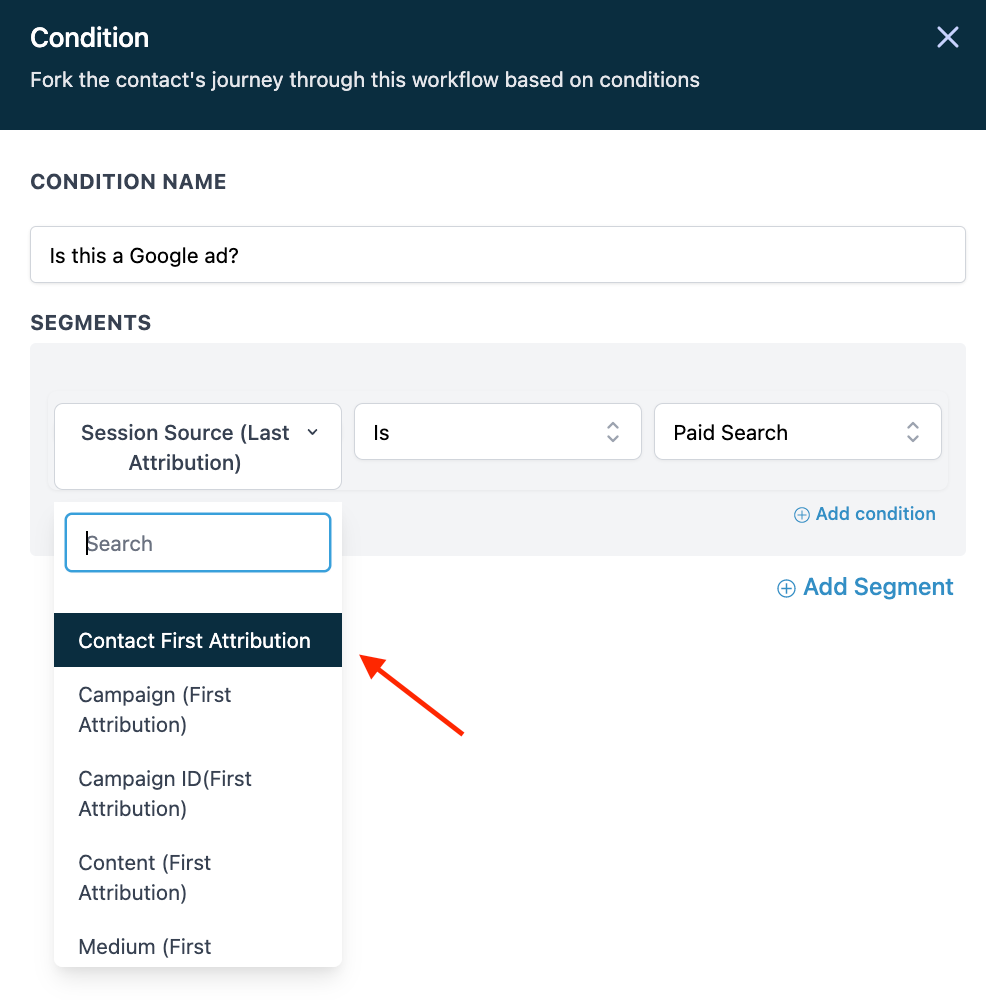 - Choose the Contact’s first or last attribution (how they originally or most recently engaged with your system). Add “Is > Paid Search”