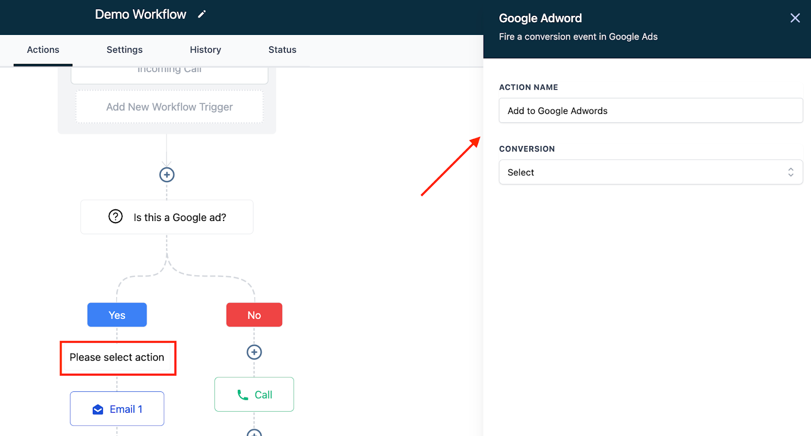 - Under the “Yes” path (meaning it IS from a Google ad), you can add too Google Adwords for reporting purposes.