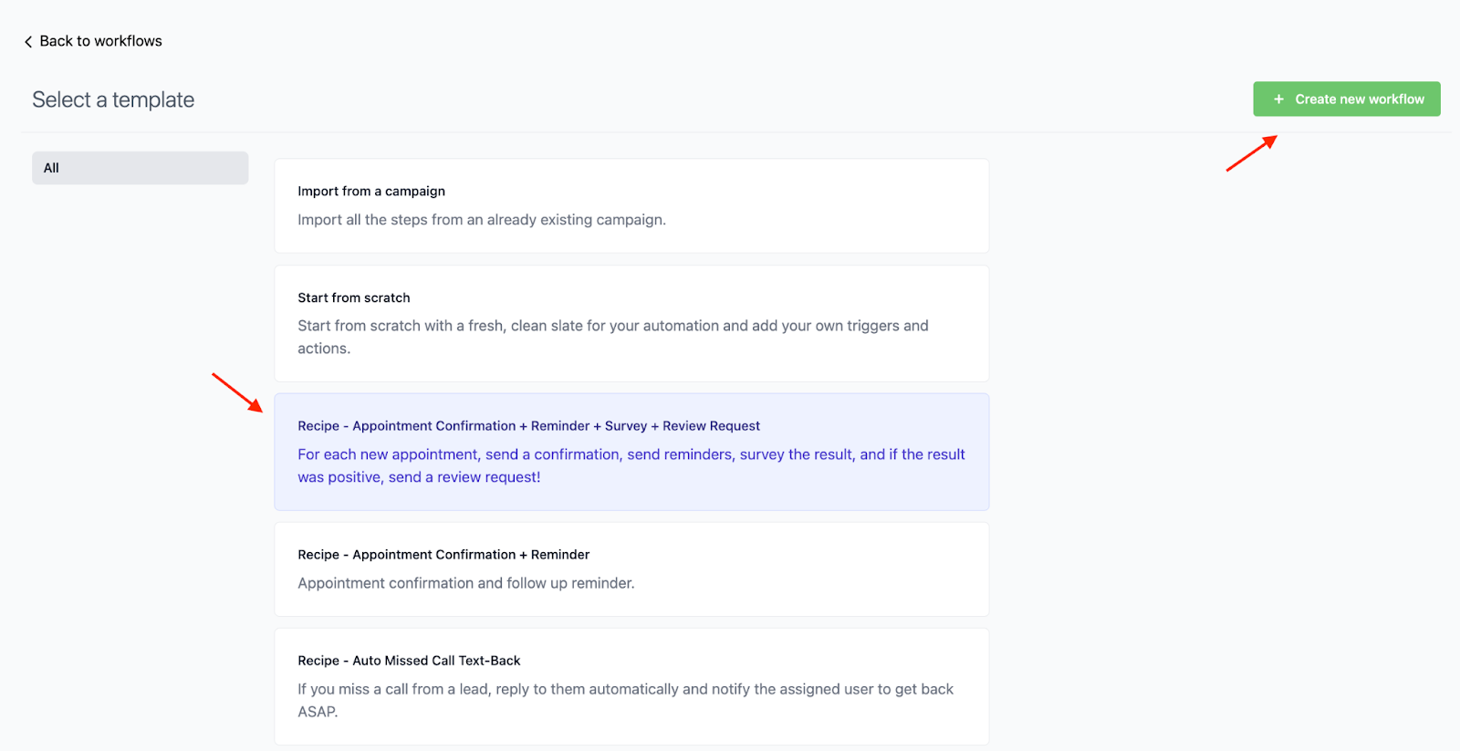 To use a Recipe, simply select the one you wish to use (which will highlight it in color) and then click “+Create new workflow”.