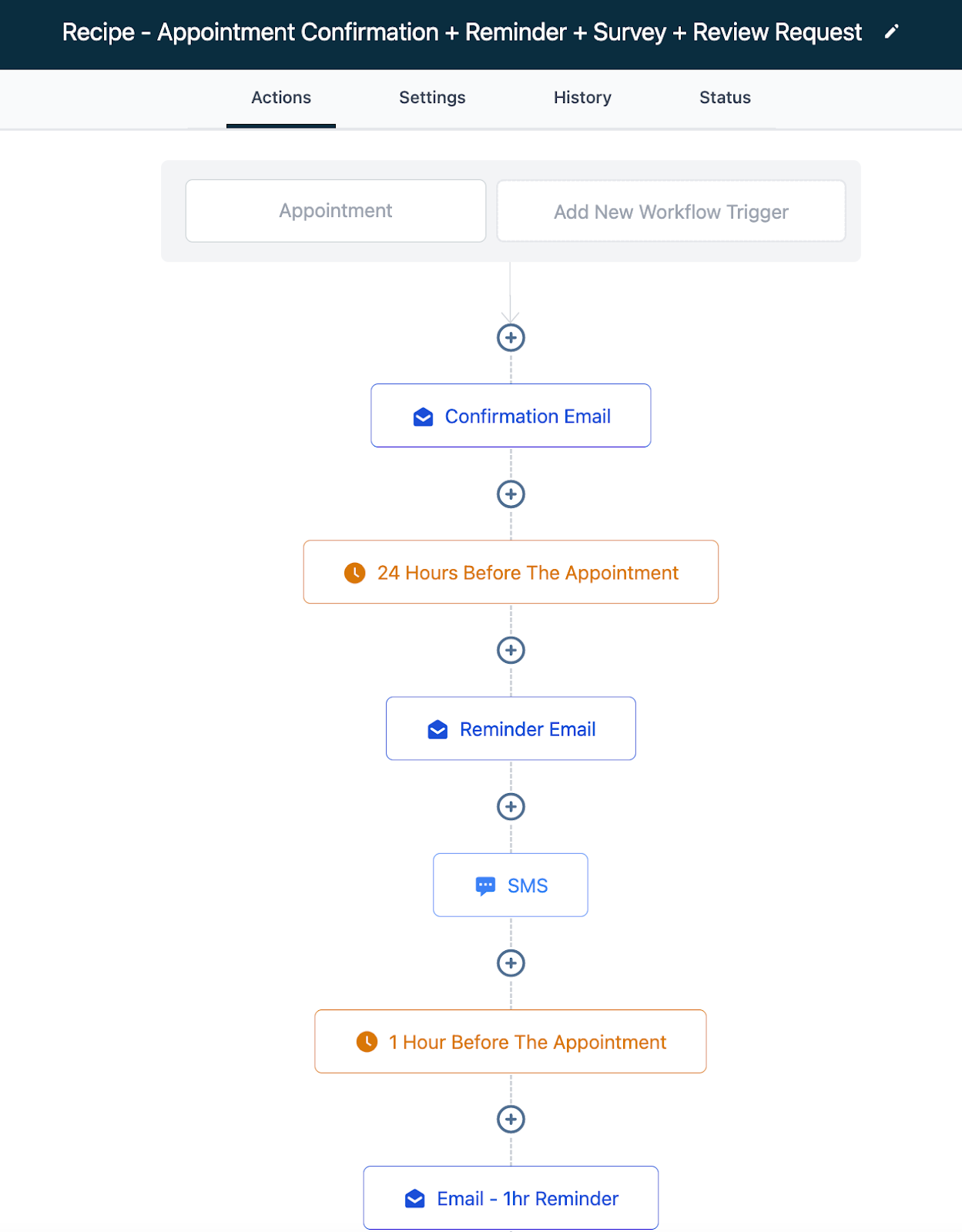 • Appointment Confirmation + Reminder + Survey + Review Request: For each new appointment, send a confirmation, send reminders, survey the result, and if the result was positive, send a review request!