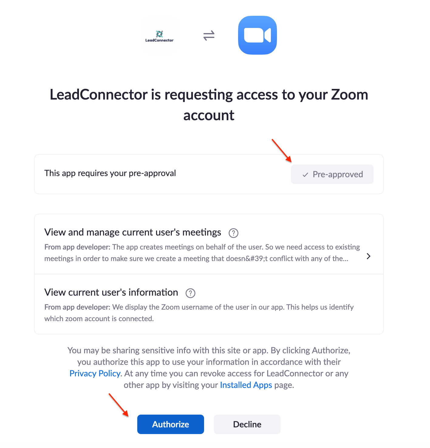 - Once logged into Zoom, you’ll see the system access request. Be sure the pre-approval is complete (if not you can click to do so.)