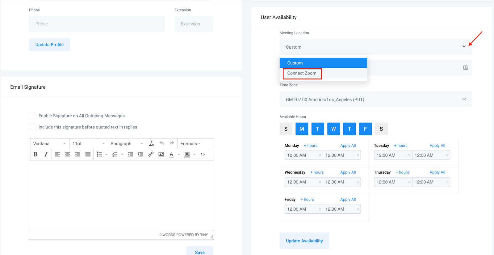 - Under “User Availability” choose “Connect Zoom” and click “OK” in the Confirmation window that pops up.