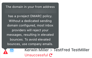 “The domain in your from address (ran@domain.com) has a p=reject DMARC policy. Without a dedicated sending domain configured, most inbox providers will reject your messages, resulting in elevated bounces. To avoid elevated bounces, use company emails.”