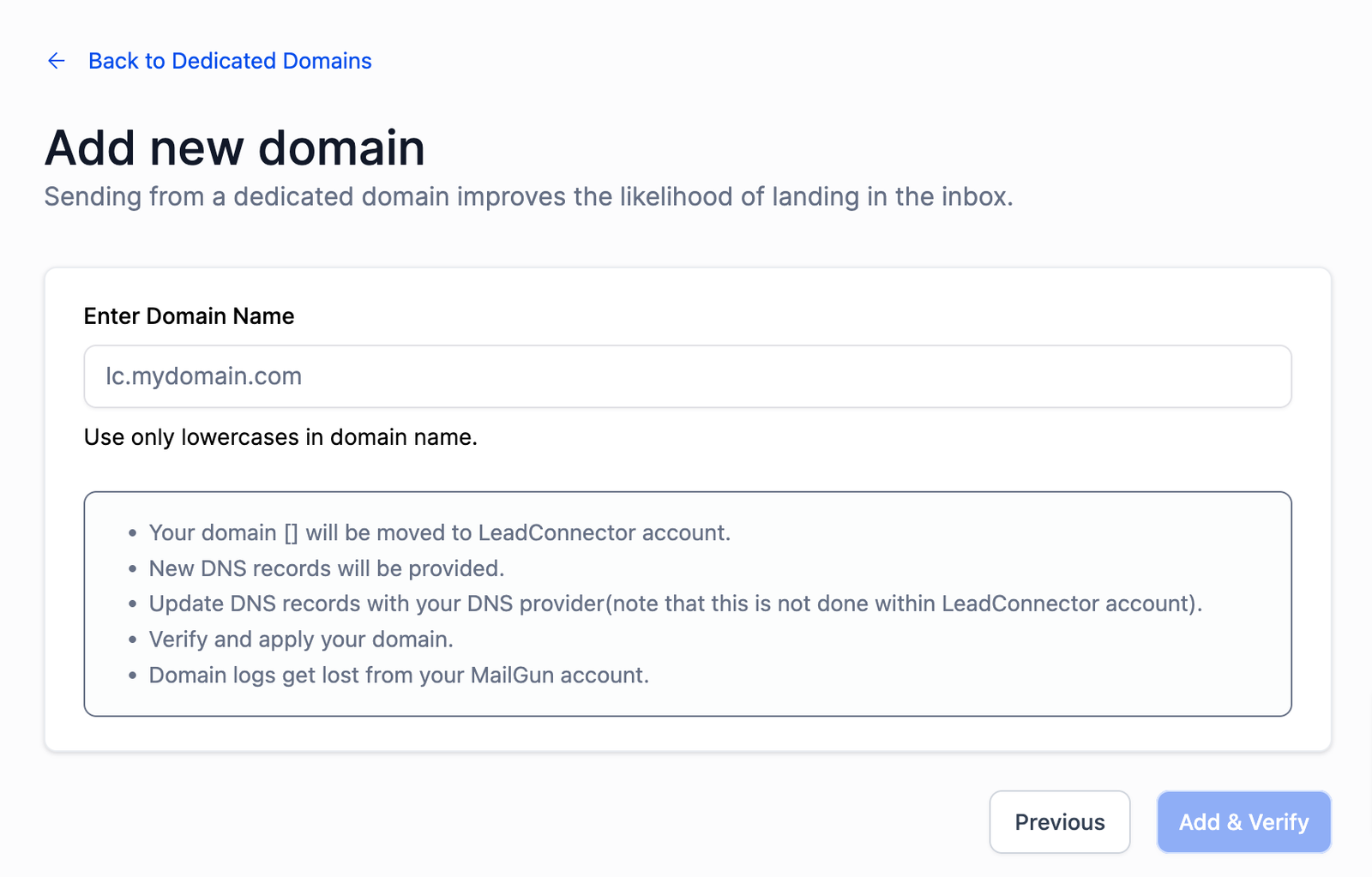 - Enter the domain you want to use in the “Enter domain name” field, then click “Add & Verify.”