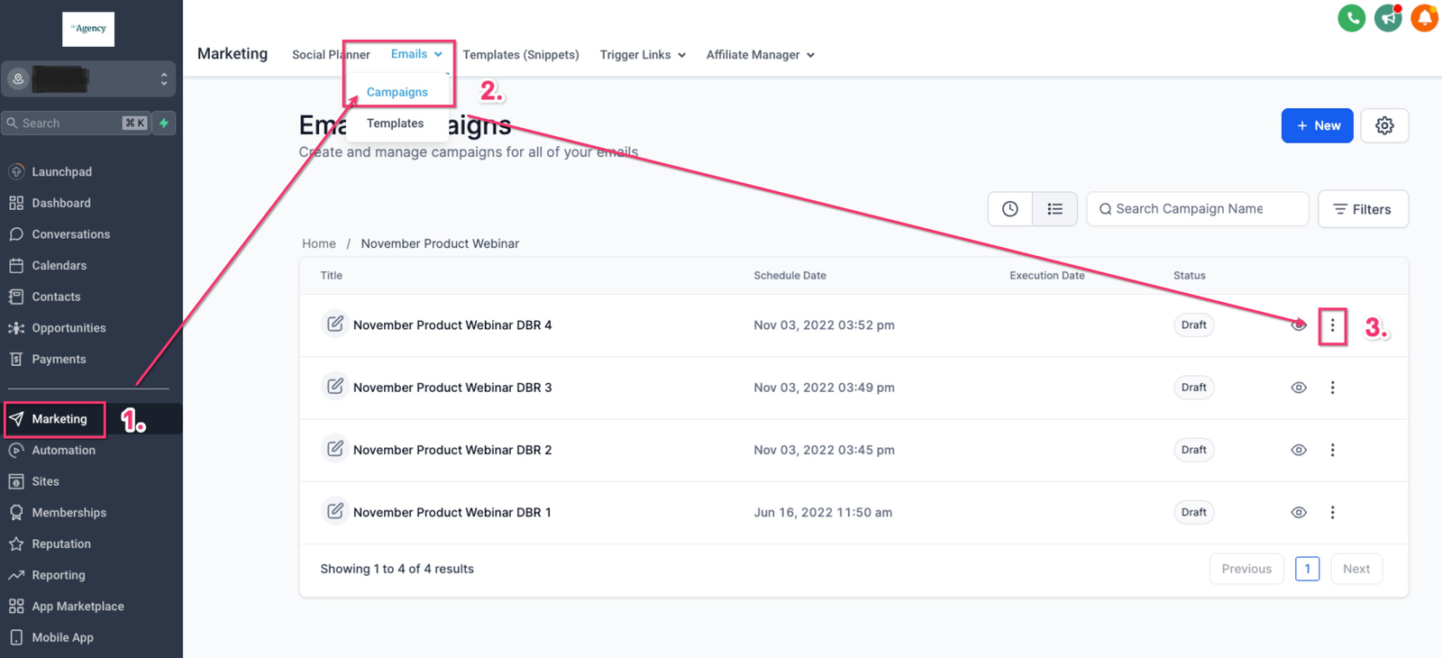 - Go to “Marketing” > “Emails” > “Campaigns” and find your email campaign.