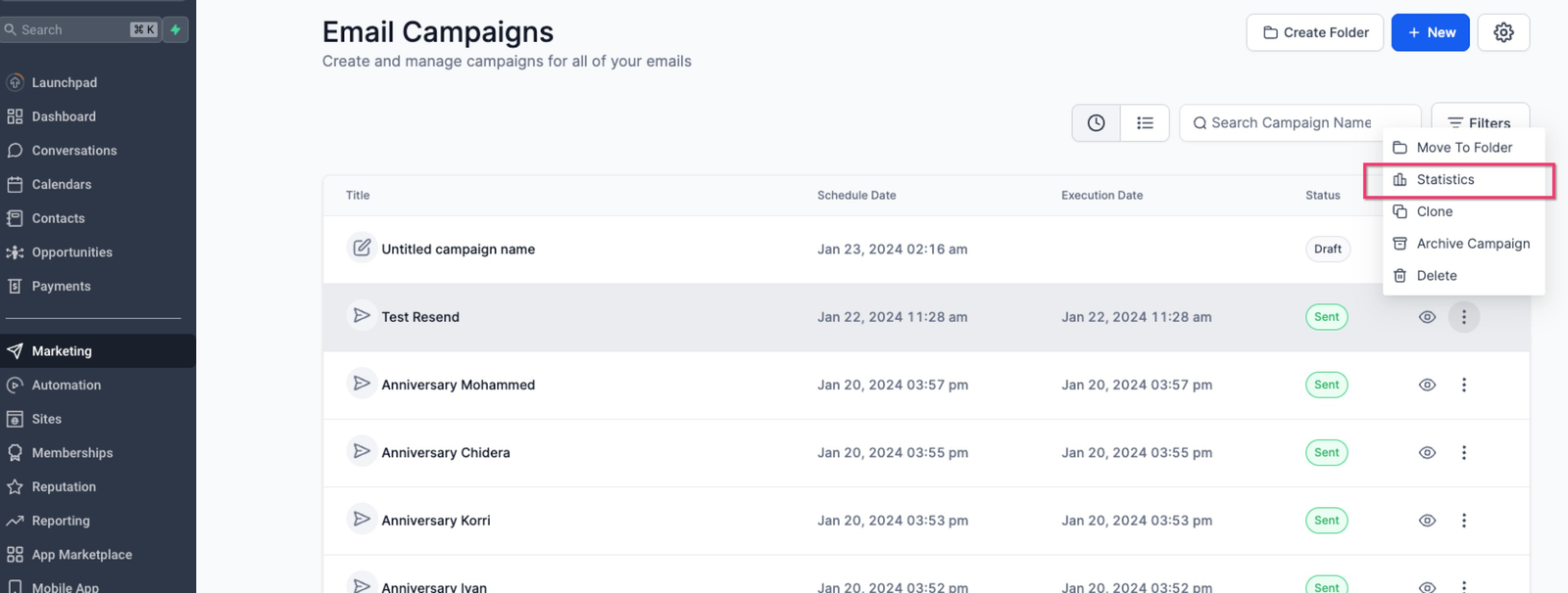 Click the “three dots” icon to the right of the campaign and select “Statistics.”