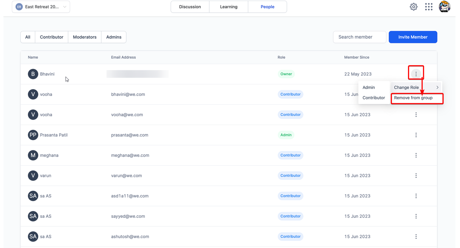 Admins and owners have the authority to manage group members’ access, including the ability to remove them from the group. To revoke access from a member, follow these steps: