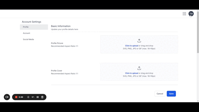 - Users can click on their initials on the top right to access their View or Edit Profile area. From here, they can access the Social Media tab to choose whether or not they wish their Email/Phone to be visible.