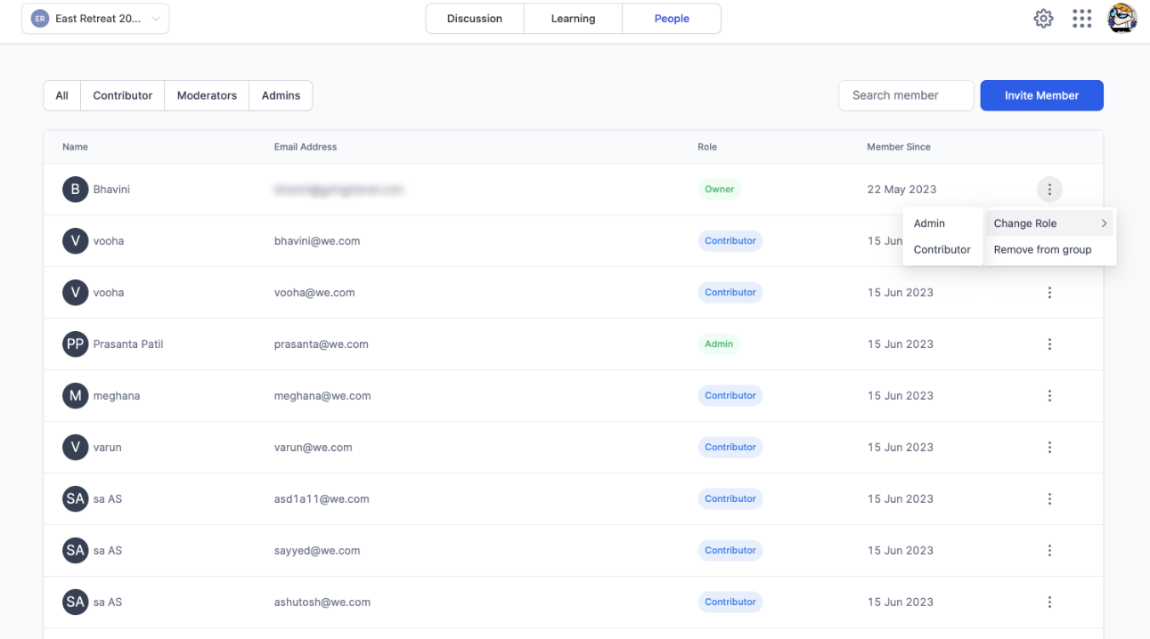 Admins and owners can manage the access of group members within the community. To modify the access of a member, follow these steps: