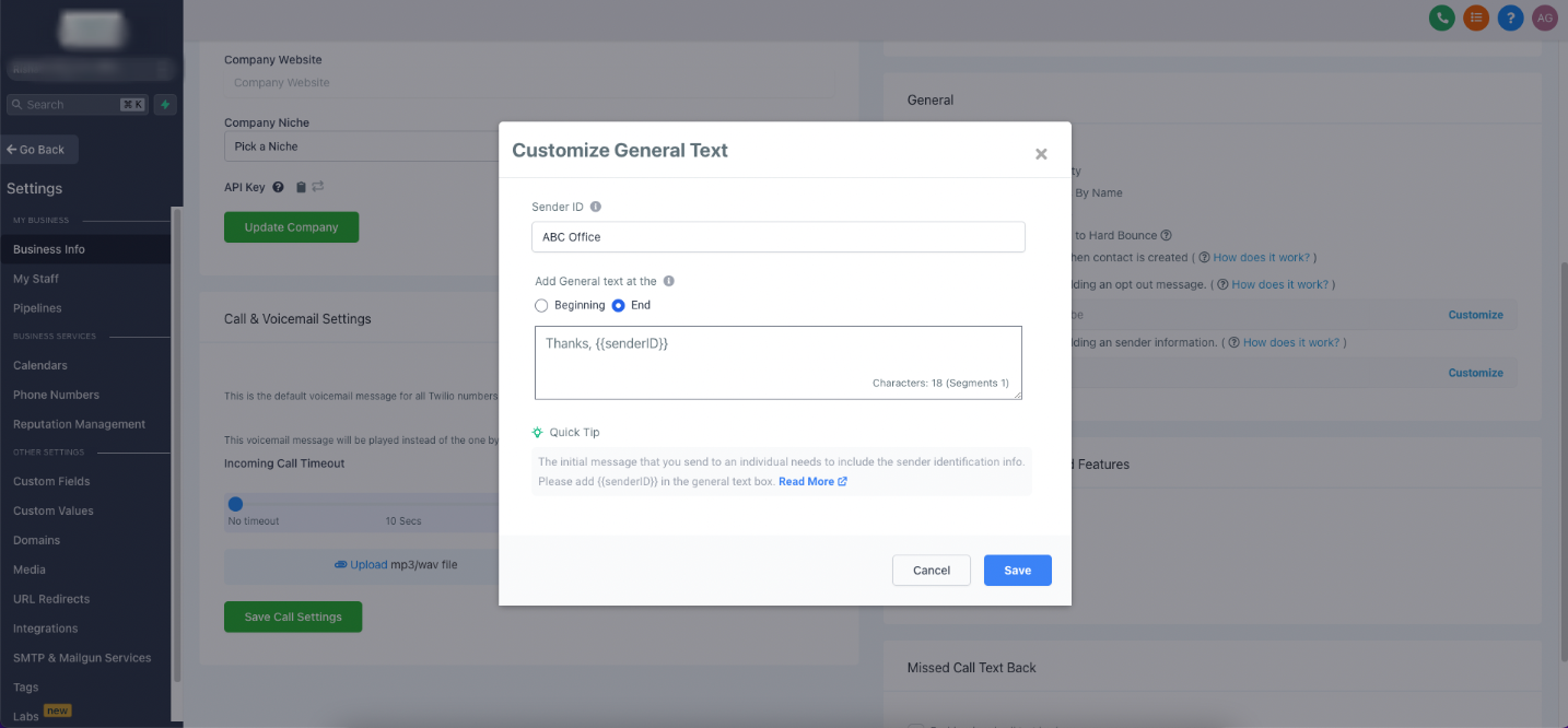 • SenderID: Every message you send must clearly identify you (the party that obtained the opt-in from the recipient) as the sender, except in follow-up messages of an ongoing conversation. We will additionally add the sender info: “Thanks, <account Name>.”