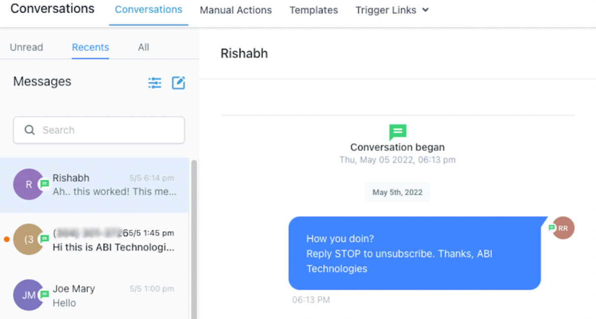 Please note: Opt out message” feature is applicable to Bulk action(Bulk SMS), Workflow and campaigns and is not applicable to One on One conversation.