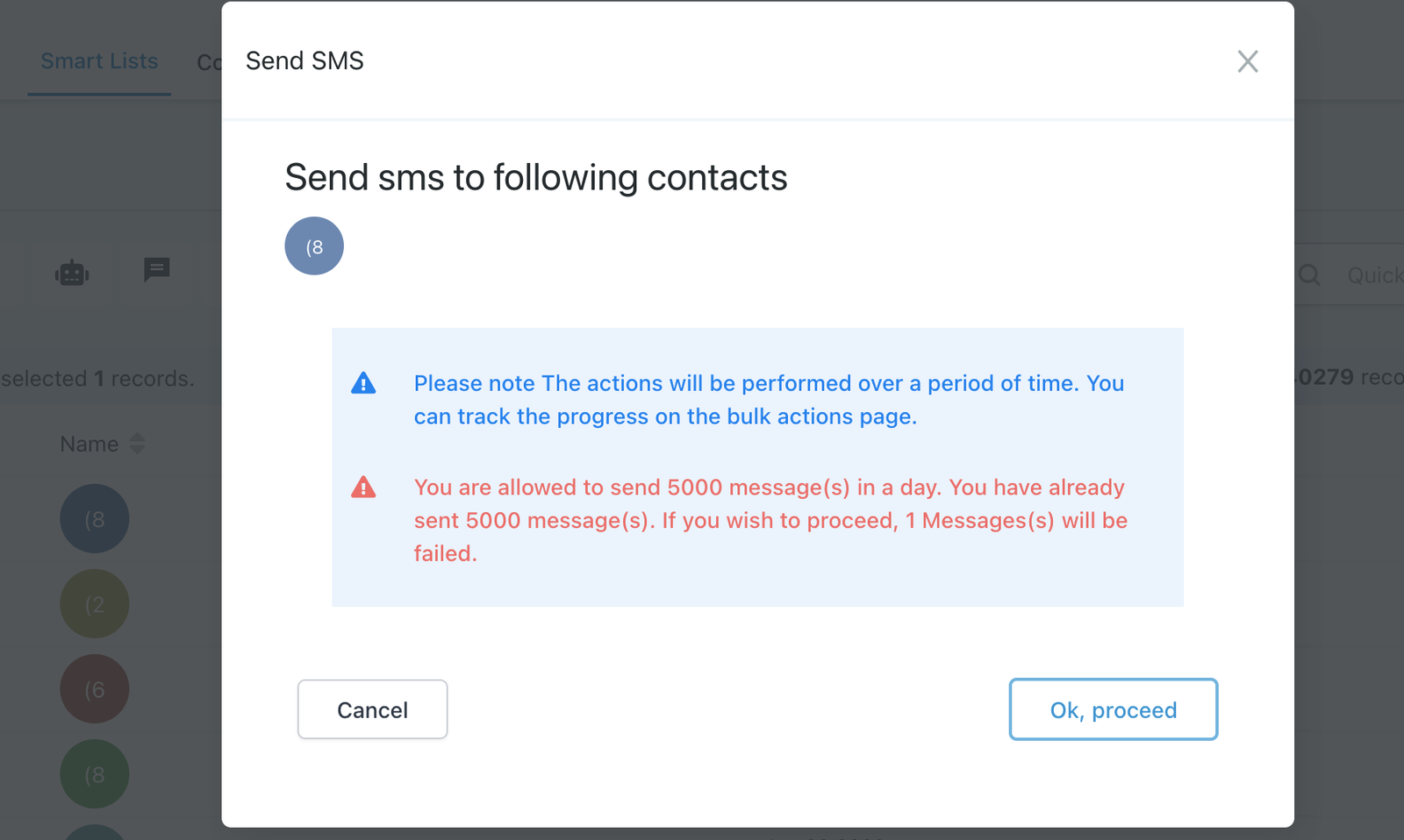 Bulk Action: You can send 5000 message(s) in a day. You have already sent 5000 messages (s). If you wish to proceed, 1 Message(s) will be failed.