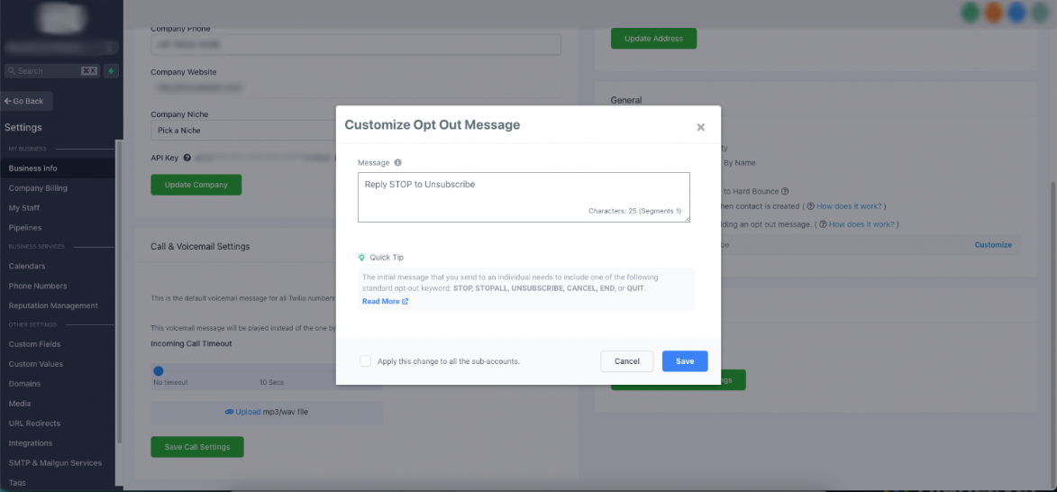 Go to Sub-account -> Settings -> Business Info -> General, where you can customize the opt-out message; below is the screenshot for reference: