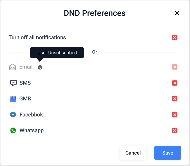 Permanent DND: The DND set at the contact level cannot be revoked by the agency or the account as the contact cannot receive the message or has opted out from receiving messages.