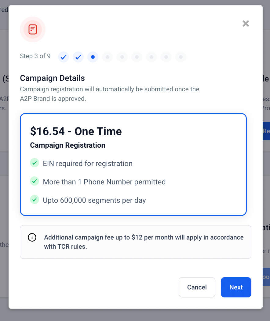 Yes, since January 2023 there is a fee charged by carriers and The Campaign Registry for vetting your brand & campaign applications. You can find the details of the fees associated with A2P 10DLC here.