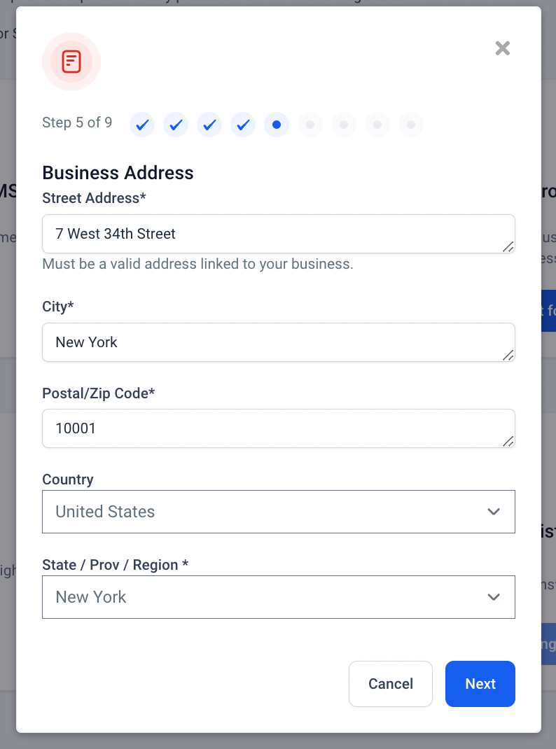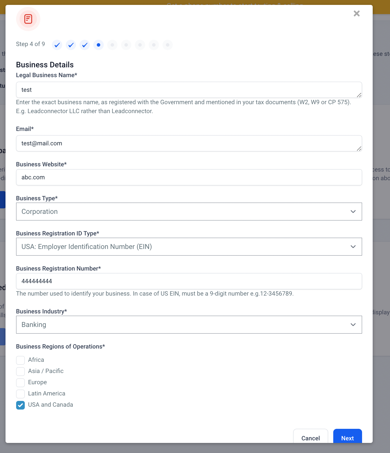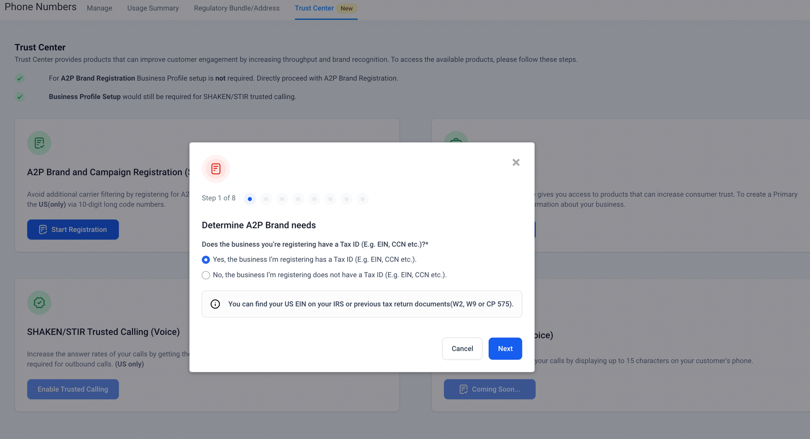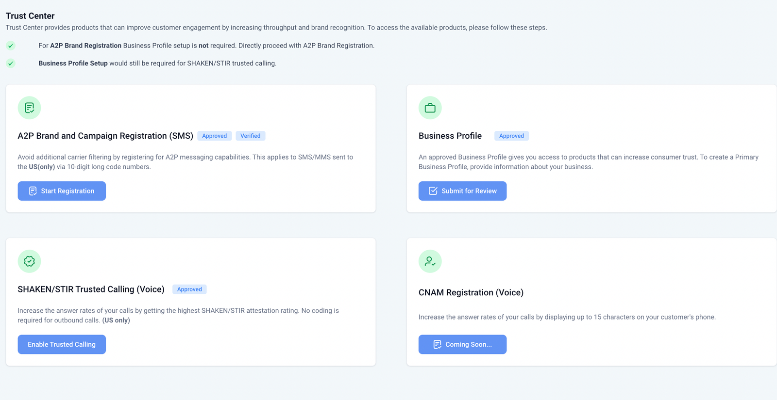 The prerequisite to A2P registration is to create a business profile providing the EIN and additional business registration information.