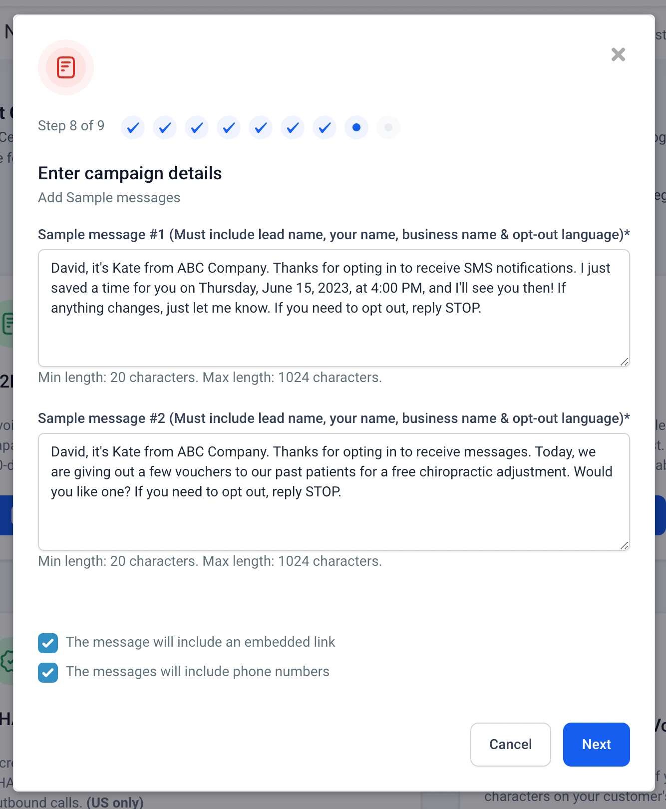 Provide Production Sample Messages and select if the hyperlink and phone number will be shown in the SMS.