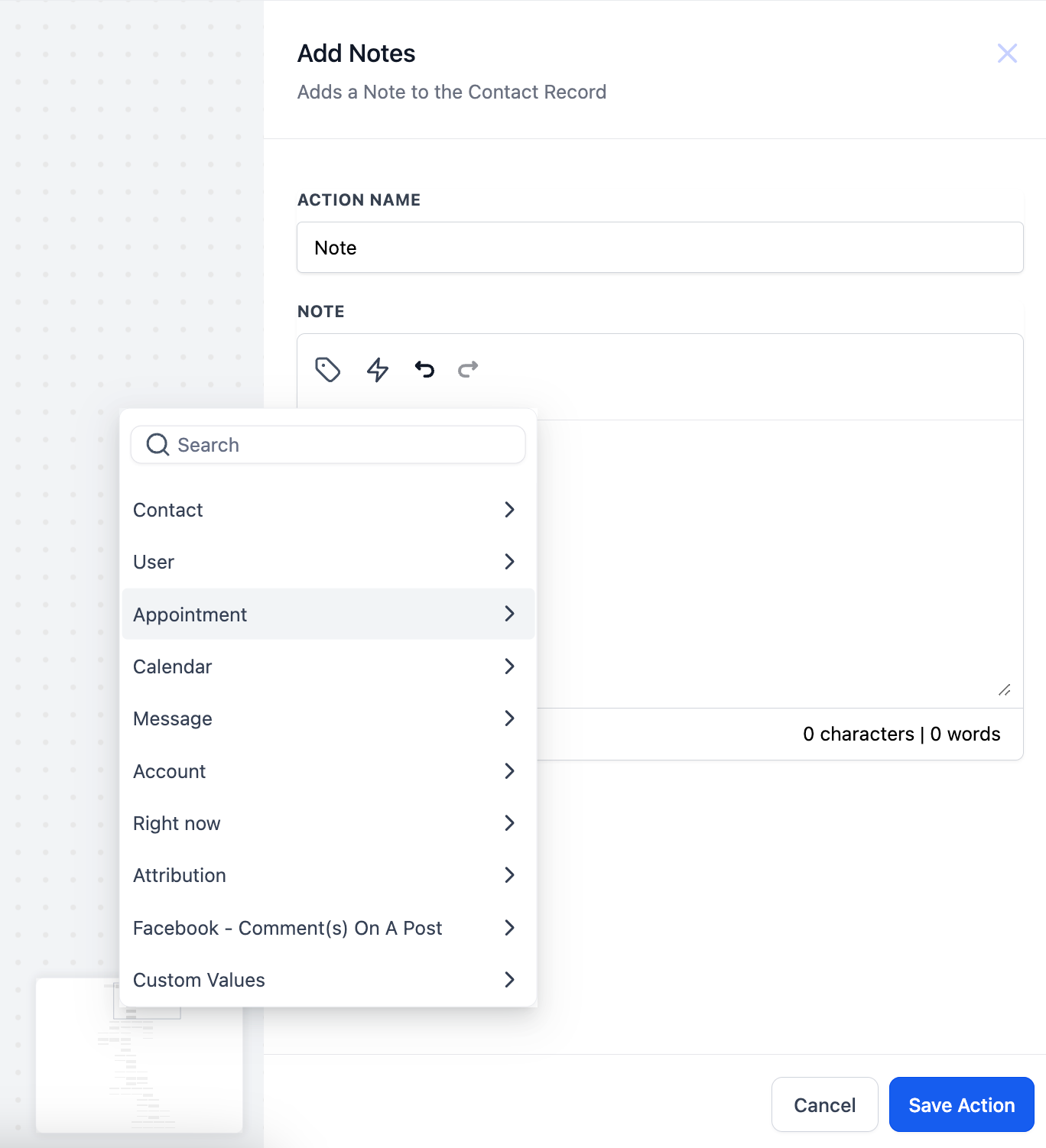 - Choose the Action Type: Select “Add to Notes” from the list of available actions.