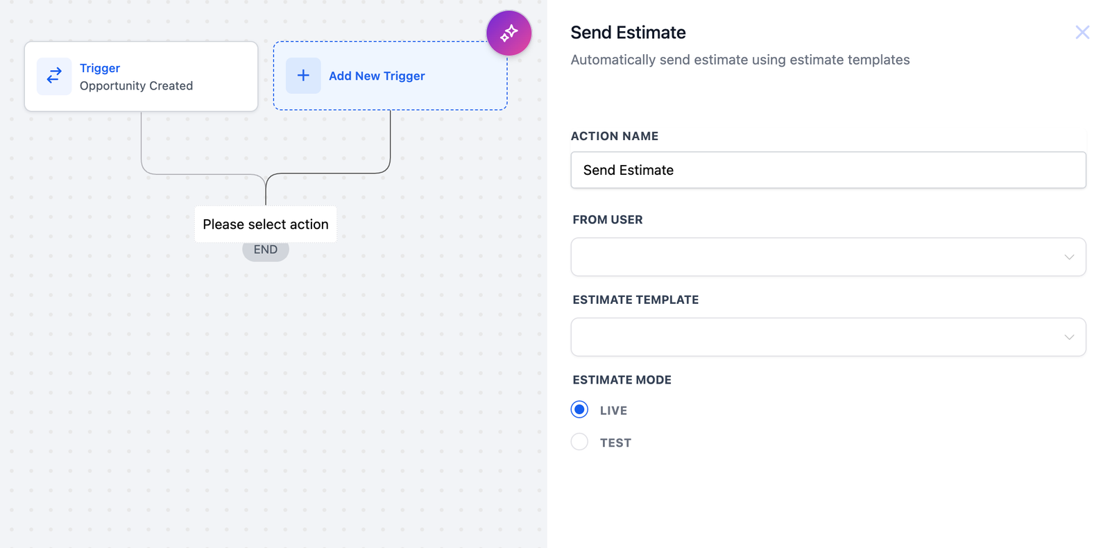 This action enables the workflow to send a customized estimate using a template to a customer upon the occurrence of a specified trigger. Users can select templates and designate the estimate mode as live or test.
